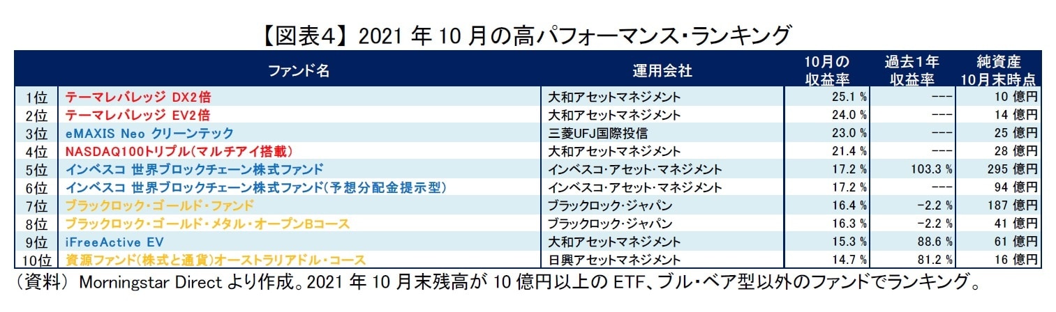その他、10月は資源価格高騰からその恩恵を受けた資源関連ファンドの一部([図表4]黄太字)も好調であった。