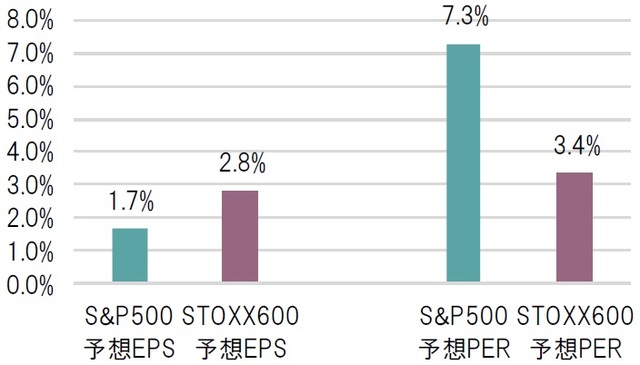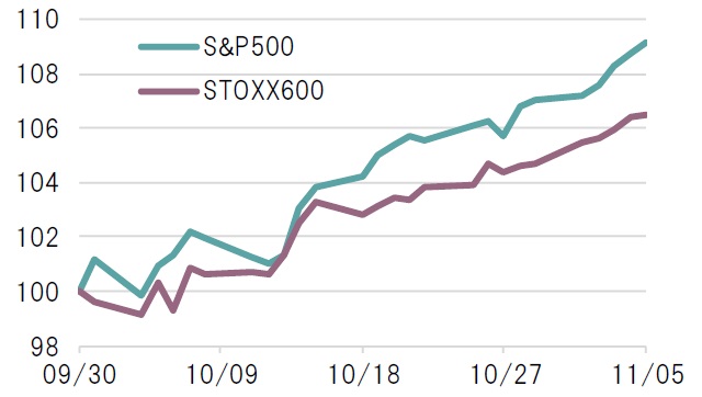 さらに目立ったのが欧米株におけるバリュエーションの上昇だ。S&P500指数の12ヵ月先予想PER(株価収益率)は、9月末時点の20.1倍から11月5日時点の21.5倍へ7.3%上昇した。また、STOXX600指数の12ヵ月先予想PERも同期間で15.5倍から16.0倍へ3.4%上昇した。