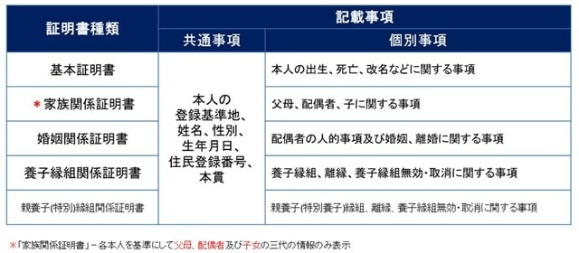 2.家族関係証明書…本人を中心に、父母・配偶者・子供の三代の情報が記載されます。祖父母や孫及び、兄弟姉妹の情報は記載されません。また、子供は長男や次男などの続柄や実子・養子の区別などは記載されずすべて「子」と記載されます。