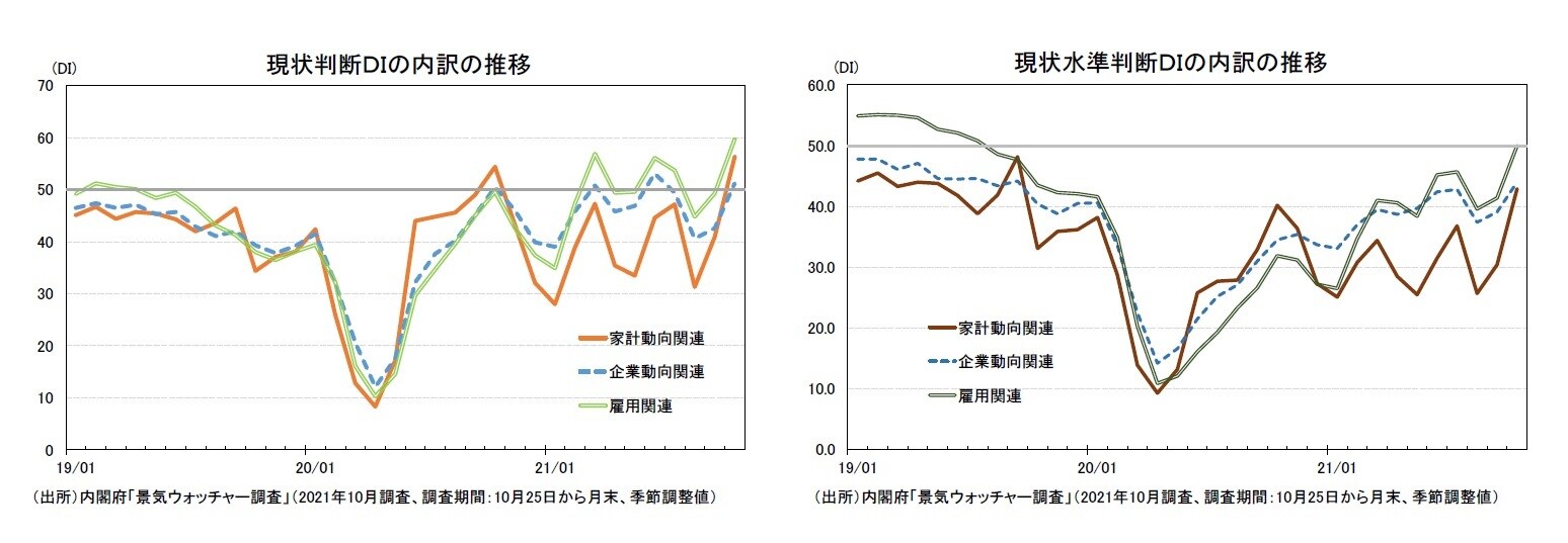 現状判断DIの内訳をみると、全ての内訳で大幅な上昇となった。家計動向関連は56.3(前月差15.4ポイント)、企業動向関連は51.2(同8.6ポイント)、雇用関連は59.7(同10.4ポイント)であった[図表4]。
