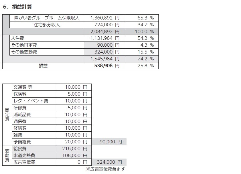 入居定員3人の試算結果による月額マイナス8万9424円・年額マイナス107万3088円と比べると、スケールメリットが活かされていることが分かります。