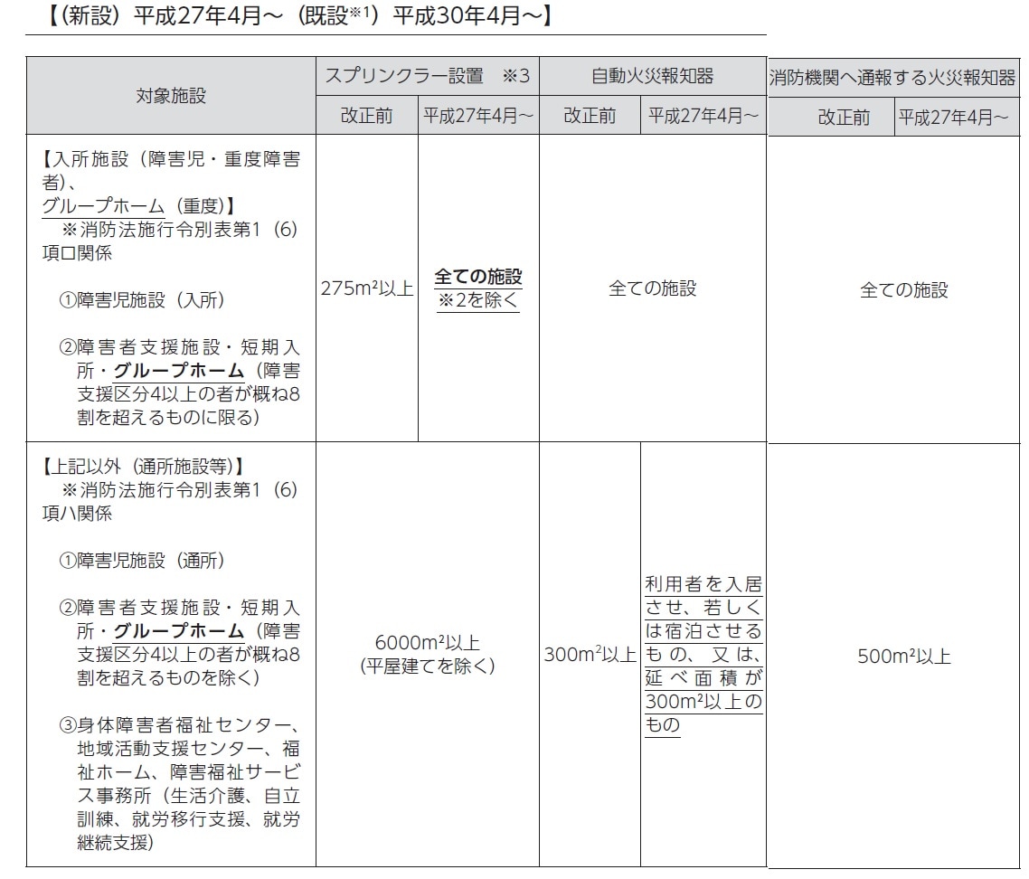 障害支援区分4以上の入居者が8割以上いるグループホームに義務付けられているのが火災報知設備とスプリンクラーです。