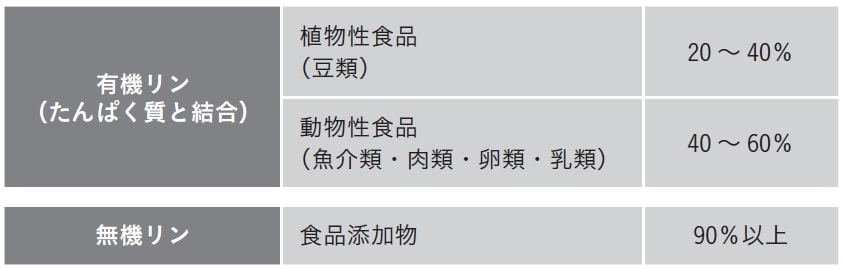 そこで覚えておきたいのが、リンの吸収率です。リンを含む食べ物を口にしても、そこに含まれているリンをすべて体にとり込んでしまうわけではありません。体への吸収率が高いリンと、そうでもないリンがあるのです。前者を無機リン、後者を有機リンといいます。