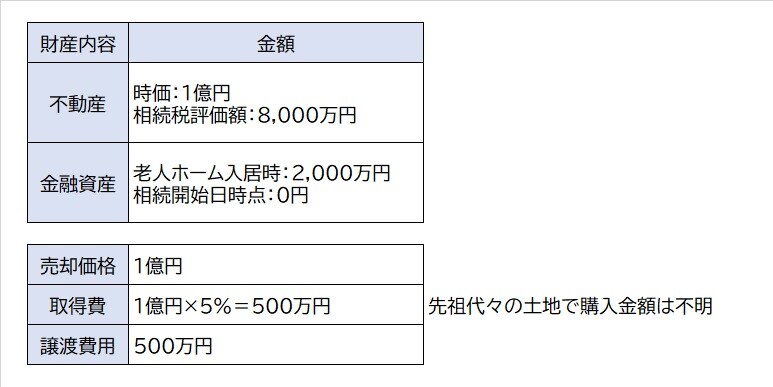 入居時にあった金融資産2,000万円と年金で施設利用料を含めた生活費をまかない、相続発生日にあった財産は、不動産売却代金手取額のみ(生前売却の場合)または不動産のみ(相続発生後売却の場合)であったとする。