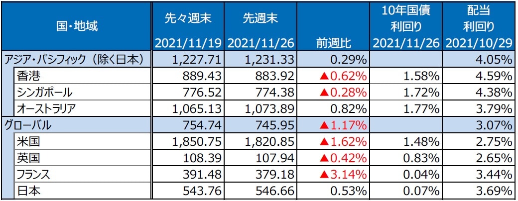 グローバル・リートは、オミクロン型への警戒感を受けて、週間で1.17%安となりました。