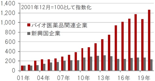 ※バイオ医薬品関連企業:ナスダック・バイオテック指数、新興国企業:MSCI新興国株価指数構成銘柄