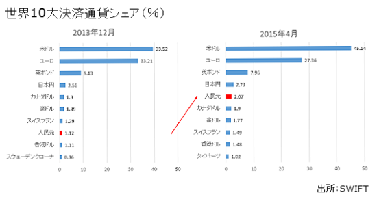 L/C(信用状)市場での使用では、すでに13年から世界2位、15年1月にはシェアは9.43%まで高まりました。また、対中取引の10%以上を人民元決済で行っている国(一般に「人民元の河を渡る」ラインと言われる)は、13年4月から本年3月にかけて19か国増え、56にのぼります。中でも、台湾、韓国等アジアを除くと、仏、英、伊等欧州諸国、およびカナダが人民元決済を増やしていることに特徴があります。