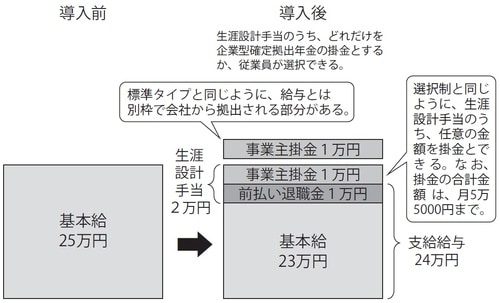 例えば、基本給25万円だったものを、基本給23万円+生涯設計手当2万にします。そのうえで、それとは別に会社が上乗せで1万円の掛金を支払うということです。当然、会社の支出は1万円分増えます。選択制だと、従業員が企業型確定拠出年金に加入しないことも可能になります。