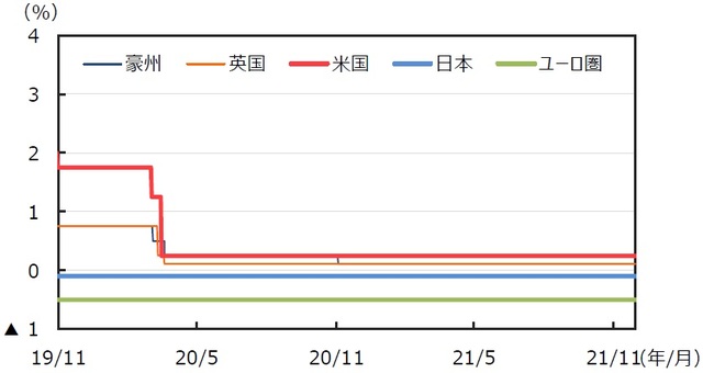 主要国の10年国債利回り(長期金利)はオミクロン型への警戒感から低下しました。米国の長期金利は、景気回復とインフレ懸念に伴う米利上げ観測の高まりから一時上昇しましたが、月末にかけて大幅に低下しました。ドイツの長期金利は、欧州での従来の新型コロナウイルスの感染再拡大に加えて、オミクロン型の感染が警戒され、大きく低下しました。日本でも、景気鈍化懸念から長期金利が低下しました。