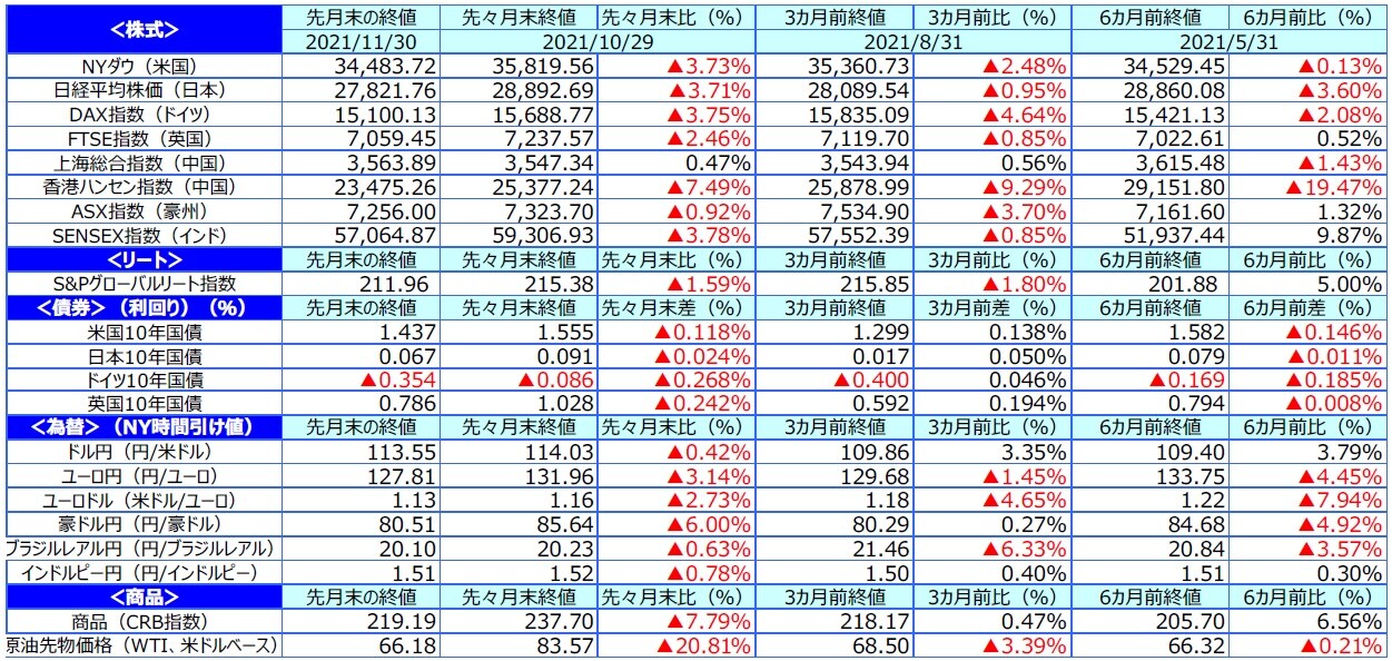 米国株式市場は、主要3指標が上・中旬にかけて相次いで史上最高値を更新したものの、月末にかけて大きく下落しました。3日のFOMCでテーパリングの開始が決定されましたが、パウエルFRB議長が利上げに慎重な姿勢を維持したことが好感され米国株は上昇基調となりました。しかし、月末にオミクロン型への懸念が広がり、大きく値を崩しました。NYダウが前月比▲3.7%、S&P500種指数が同▲0.8%でした。ナスダック総合指数は同+0.3%とプラスを維持しました。