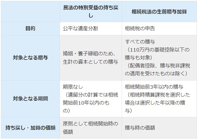 民法の特別受益の持ち戻しと相続税の生前贈与加算の違いをまとめると、[図表3]のようになります。