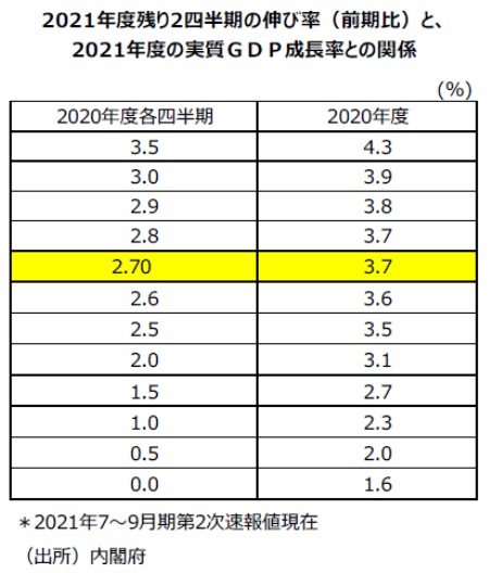 ●「令和3年度の内閣府年央試算」の21年度実質GDP成長率見通し・前年度比+3.7%を達成するには、21年度残り2四半期で各々前期比年率+11.3%(前期比+2.70%)が必要であるので、達成は難しいだろう。20年度から21年度へのゲタは+1.8%である。なお、21年度残り2四半期が前期比+1.0%だと21年度実質GDP成長率・前年度比は+2.3%になる。21年度各四半期が前期比+2.0%だと21年度実質GDP成長率・前年度比は+3.1%になる。
