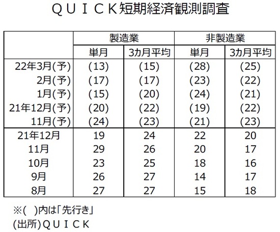 ●QUICK短観12月調査の製造業の3月までの「先行き見通し」は+13で12月実績の+19より6ポイント悪化の見込み、一方、非製造業の3月までの「先行き見通し」は+28で12月実績の+22から6ポイント改善予想である。