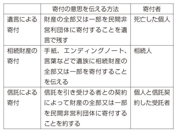 また、信託の仕組みを使って、将来相続の対象となるべき財産を民間非営利団体に寄付することもできます。これら遺言による寄付、相続財産の寄付、信託による寄付の3つを本連載では遺贈寄付と総称することとします。