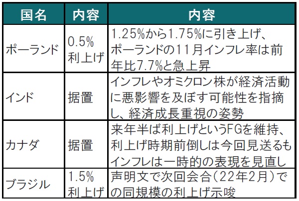 インドは成長重視の姿勢ですが、ポーランドは利上げ、カナダは据置きながらフォワードガイダンス(将来の金融政策の指針、FG)で利上げ姿勢を示すなど、総じてタカ派(金融引締めを選好)姿勢が見られました。