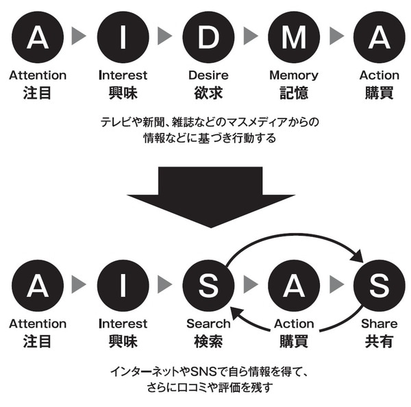 こうした新たな消費行動は「AISAS(アイサス)モデル」と名づけられ、次の五つの流れで構成されています。