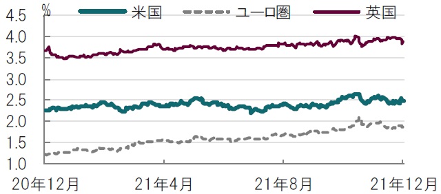 FRBも金融引締めを迫られています。12月の米連邦公開市場委員会(FOMC)では量的緩和の縮小(テーパリング)終了時期を従来の想定である22年6月から3月に前倒し、利上げも22年に2~3回が示唆されることが見込まれています。13年のテーパリングでは9ヵ月程度かけ、利上げはテーパリング後1年ほど後に実施されたのに比べ、今回は相当早い引締めペースです。それでも米国債市場では2013年の大変動に比べれば相対的に抑制されています。FRBによる市場との対話がある程度機能しているものと思われます。