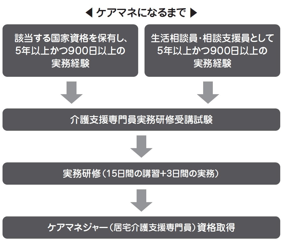 では、ケアマネになるには、どれほど大変なのか。いちばん多い介護福祉士からケアマネになった人がたどるプロセスはつぎのようなものです。