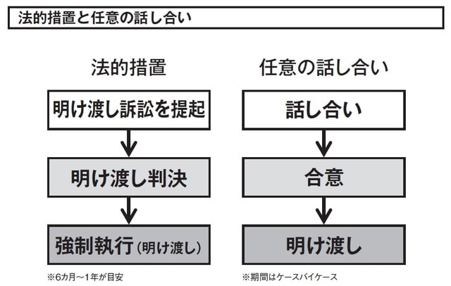 この場合は、話し合いで解決できれば、法的措置に比べれば時間が短縮できる(最短1ヵ月未満)というメリットがあります。