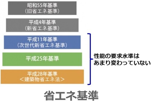 最新の基準は「平成28年基準」と呼ばれるものですが、この基準が要求している性能レベルは、20年以上前の基準である「平成11年基準」(別名:次世代省エネ基準)とほとんど変わっていません([図表1]参照)。