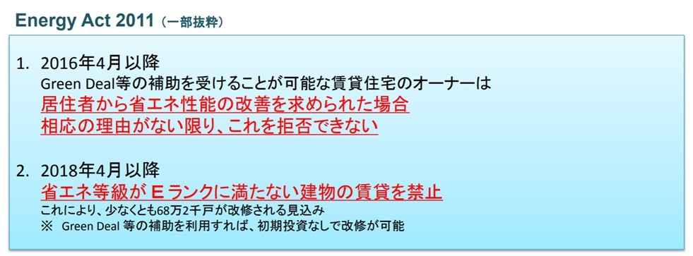 Energy Act 2011という取り組みの中で、2016年から賃貸住宅のオーナーは居住者から断熱改修工事を求められたら拒否できないことになっています。さらに2018年からは、省エネ等級がEランクに満たない建物は賃貸が禁止されています。