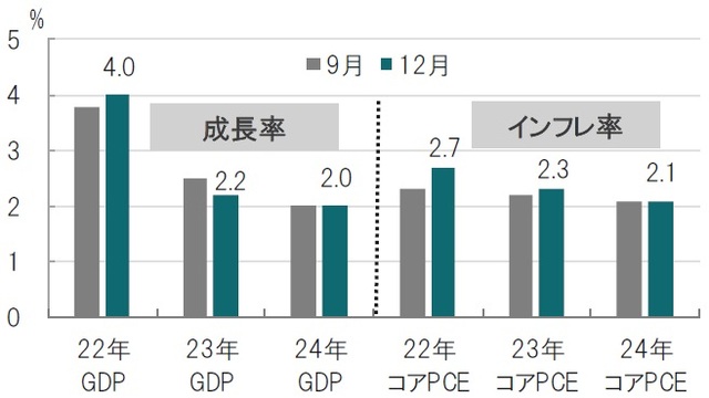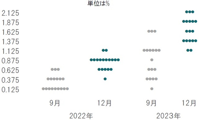 テーパリングの終了時期の想定を従来の来年6月から3月に前倒ししました。また、FOMC参加者らの政策金利見通しを反映するとされるドット・チャートでは、22年において3回の利上げが想定されており、9月時点の1回(中位数)の想定に比べ引締め姿勢となりました(図表1参照)。