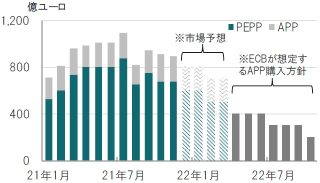 欧州中央銀行(ECB)は2021年12月16日に開催した政策理事会で、コロナ禍で導入した緊急買い取り制度による資産購入(PEPP、新規)を22年3月末で打ち切ることを決定しました。具体的にはPEPPの資産購入は22年1-3月期に現行の600億ユーロから減額した上で、3月末に終了させるとしています(図表1参照)。