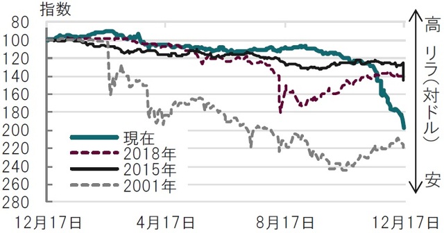 トルコでは通貨危機などと形容される局面が過去何度かありますが、主なものについて期間を固定し(12月~翌年12月)指数化により比較すると、今回のリラ安は底値が未だ見えない点で深刻な事態と見られます(図表1参照)。
