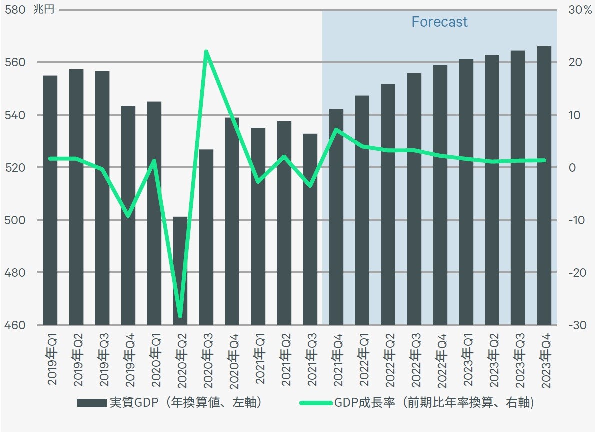 感染第6波がなければ、サービス業を中心に消費の着実な回復が期待される。企業の設備投資も緩やかな増加傾向となろう。供給制約も徐々に解消に向かうことが期待される。経済規模は2022年Q3にはコロナ禍前(かつ消費税増税前)の2019年Q3の水準を回復すると予想する。