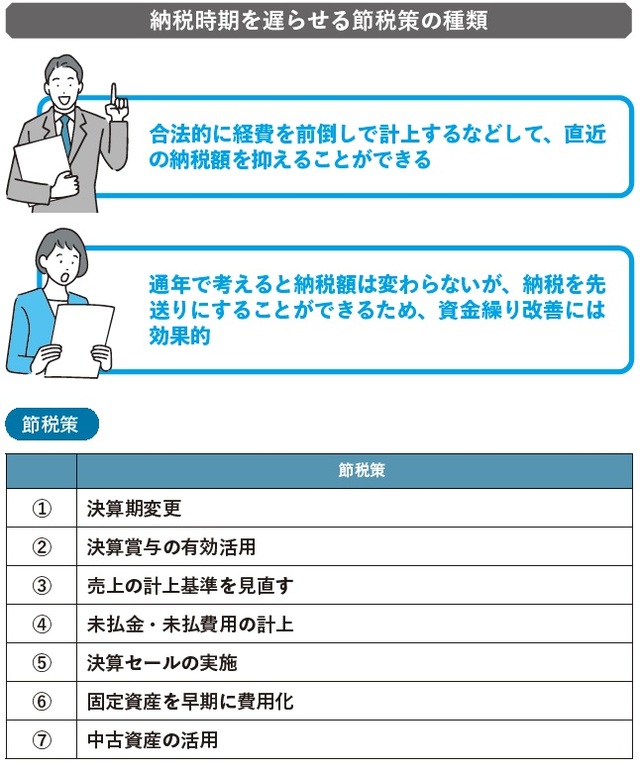 節税策には、大きく分けて「納付時期を遅らせる節税策」と「税額そのものを減らせる節税策」の2種類あります。