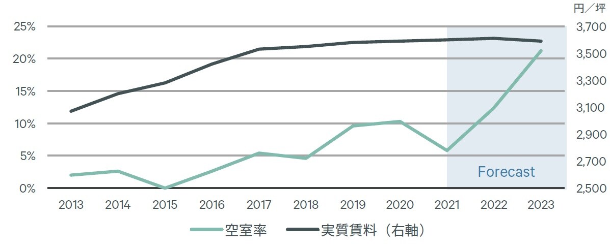 低い空室率を反映して、実質賃料は上昇基調を維持する見通しである。2022年、2023年はそれぞれ2%超の上昇率、2023年Q4に4,310円/坪を予想する。