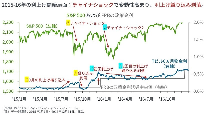 2015年12月から始まった前回の引き締め局面を思い出すと、【図表2】のとおり、①利上げ開始直前の2015年8月には(米利上げ観測からのドル高を遠因とする)『チャイナ・ショック』(=人民元の切り下げ)があり、