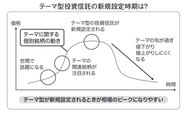 テーマ型の投資信託が新規設定され、販売されるときには、すでに相場のピークになっていることが多くあります。テーマがいちばん盛り上がっているときにそのテーマの投資信託を買っても、そのあとの値上がりの余地は大きくありません。むしろ、しばらくしてから価格が徐々に下落し、その後は値上がりが期待できない、という状態に陥る可能性があります。