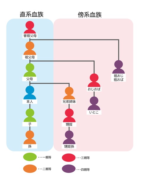 日本民法では、第三順位までですが、韓国民法では第四順位まで規定されており、「四親等以内の傍系血族」とされています。三親等の傍系血族としては、伯父(叔父)さんや伯母(叔母)さんが該当し、四親等の傍系血族としては、従兄弟や祖父母の兄弟姉妹が該当します。日本に比べて相続の範囲が広いことになります[図表2]。