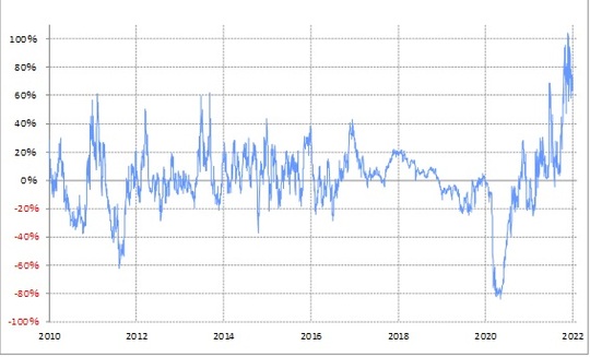 そんな米2年債利回りは、先週にかけて0.7%を上回るまで上昇しました(図表2参照)。これを90日MA(移動平均線)からのかい離率で見ると、プラス60%以上になります(図表3参照)。経験的に、同かい離率のプラス60%以上は、短期的な「上がり過ぎ」懸念が極めて強い可能性を示しているのです(図表4参照)。