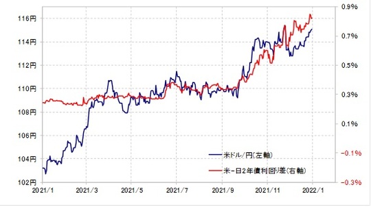 米ドル/円は昨年の途中、6月ごろから、金融政策を反映する日米2年債利回り差と高い相関関係で推移してきました(図表1参照)。その意味では、今週の米ドル/円の展開は、日米2年債利回り差、とくにその主役である米2年債利回りがカギになりそうです。