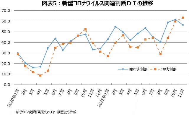 「景気ウォッチャー調査」では「新型コロナウイルス」という言葉が2020年1月調査で初めて登場した。それ以降、新型コロナウイルスの感染拡大の影響が景況感の大きなマイナス材料となっていたが、最近ではプラス要因として働くようになった。11月調査で新型コロナウイルスに触れたコメントから関連現状判断DIを作成すると63.3と20年1月以降最高となった。新型コロナウイルス関連先行き判断DIの方は10月に61.4と最高水準を更新したあと、11月は56.5へとやや低下した(図表5)。