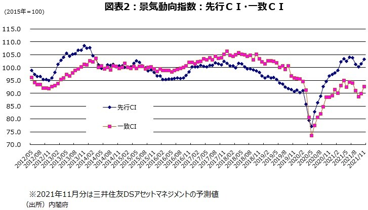 「11月の景気動向指数CIは先行・一致とも2ヵ月連続上昇見込み。21年の自殺者数は2年ぶり減少の見込み。今年の漢字『金』、JRA売得金10年連続増加、Da-iCEのレコード大賞受賞など、身近なデータでは景気回復を示唆するものが多い」