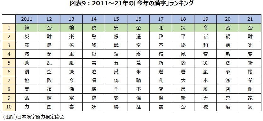 12月13日に清水寺で、2021年『今年の漢字』は『金』だと発表された(図表9)。オリンピック・パラリンピックで日本選手が活躍し多くの金メダルを獲得したことや、大谷翔平選手がメジャーリーグを舞台にベーブ・ルース以来のリアル二刀流での大活躍でMVP獲得という金字塔を打ち立てたことなどが選ばれた理由だそうだ。