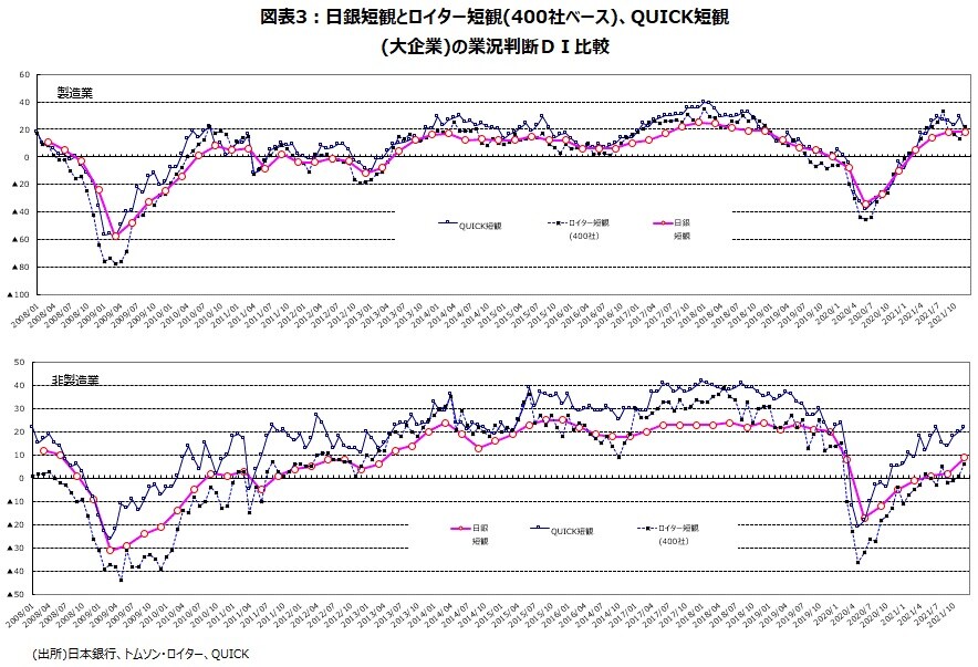 一方、大企業・非製造業・業況判断DIは+9と前回から7ポイント上昇、コロナ前の19年12月の+20以来の水準になった(図表3)。全規模・全産業・業況判断DIは+2と前回▲2のマイナスからプラスに転じ、緩やかな回復基調継続を示唆する内容になっている。