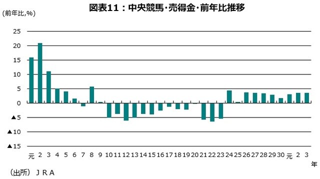 コロナ禍でも順調に推移している身近なデータが多い。競馬売上高の足元のデータを確認しよう。JRA(日本中央競馬会)の12月26日の有馬記念の売得金が前年比+5.8%となったのをはじめとして12月のG1レースは5レースが前年比増加となった。昨年が有馬記念直前の土曜日開催だったホープフルSが、今年は12月28日(火曜日)に開催され前年比+86%の大幅増加となった。21年のJRA売得金は前年比+3.6%と昨年の+3.5%を上回る増加率になり、10年連続の増加になった(図表11)。