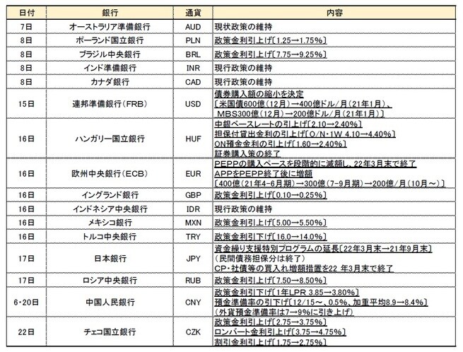 このうち、イングランド銀行は0.15%の利上げ(0.10→0.15%)、FRBは債券購入額のさらなる縮小(テーパリングの加速、900億→600億ドル/月)を決定した。