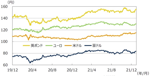 オミクロン型への警戒感が和らぎ、リスク選好の動きが強まるなか、低リスク通貨とされる円は主要通貨に対し下落しました。円は対米ドルで、オミクロン型への警戒感から月初に112円台を付けましたが、その後警戒感が和らぎ、米国の株式市場が反発したことや、FRBがFOMCでテーパリングや利上げ見通しを前倒し、米長期金利が上昇したことから、115円台に下落しました。円は対ユーロでは、ECBが理事会で金融緩和を徐々に縮小していく方針を示したことなどから、前月末の127円近辺から131円近辺に下落しました。また、対豪ドルでは、80円台半ばから83円台後半に下落しました。