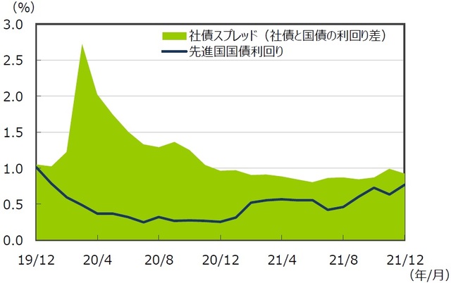 米欧の10年国債利回り(長期金利)はオミクロン型への警戒感が和らいだことや金融政策の正常化が進むとの見方から上昇しました。米国の長期金利は、オミクロン型の感染が拡大したことによる経済停滞への警戒感から月初に1.3%台前半まで低下しました。しかし、オミクロン型の重症化リスクは高くないとの研究機関の報告などから警戒感が和らいだことや、FRBが12月のFOMCでテーパリングの加速を決定し、22年の利上げ見通しを3回としたことで、金融政策の正常化が進むとの見方から1.5%台に上昇しました。ドイツの長期金利は、ECBが理事会で異例の金融緩和を徐々に縮小していく方針を示したことなどから、▲0.2%を上回る水準に上昇しました。日本の長期金利は横ばいでした。投資適格社債については、国債と社債の利回り格差が縮小しました。