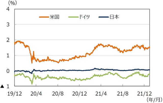 米国の10年国債利回り(長期金利)は、オミクロン型への警戒感が和らいだことや、米連邦準備制度理事会(FRB)が12月のFOMCでテーパリングの加速を決定し、2022年の利上げ見通しを3回としたことで、金融政策の正常化が進むとの見方が強まったことから上昇しました。ECBが理事会で金融緩和を徐々に縮小していく方針を示したことなどから、ドイツの長期金利も上昇しました。日本の長期金利は横ばいでした。