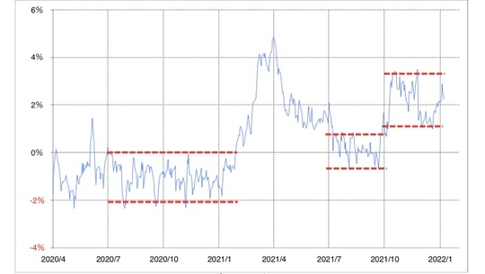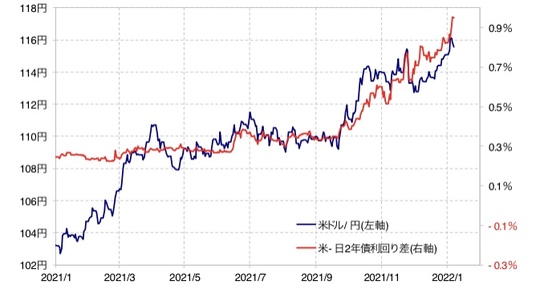 米インフレ懸念が拡大し、対策として米利上げを3月にも行うといった見方も強まるなかで、それを織り込む米2年債利回りも「上がり過ぎ」が長引くところとなっているのでしょう。
