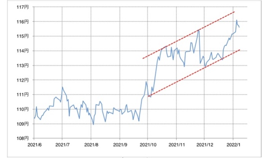 これまで見てきた米ドル高加速のパターンを参考にすると、ここからさらに米ドル高・円安が大きく広がるかは、90日MAかい離率の保合い上放れ、具体的には、90日MAが足元で113円程度なので、それを3%上回った水準である116.4円、大まかに言えば116円半ばを超えられるかがひとつの目安になるのではないでしょうか。