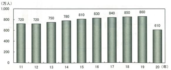 日本オートキャンプ協会の『オートキャンプ白書2021』によると、2020年のオートキャンプ人口(1年間に1泊以上オートキャンプをした人の数)は610万人であり、2019年の860万人から約3割の減少となりました(図表2)。コロナ禍により2020年4月・5月のゴールデンウィーク時期のキャンプ場の閉鎖が大きく影響した結果です。