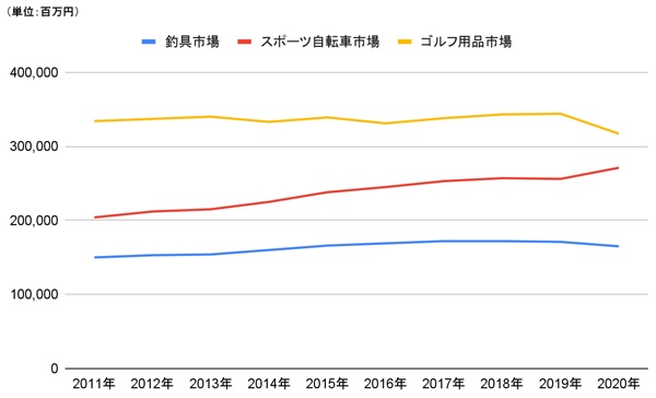 ゴルフ業界(ゴルフ用品、ゴルフ場、ゴルフ練習場)の市場規模は、1992年の約2.9兆円をピークに1993年から縮小トレンドにありましたが、当時15歳だった石川遼選手がツアー最年少優勝を飾った2007年と、渋野日向子選手が日本勢42年ぶりのメジャー制覇となる全英オープンを優勝した2019年には、市場規模がそれぞれ+230億円、+300億円拡大しています。