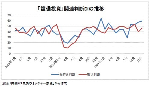 ●景気ウォッチャー調査の設備投資関連・現状判断DIは、21年5月45.0(回答した景気ウォッチャー・5人)、6月50.0(同7人)、7月50.0(同7人)、8月45.8(同6人)、9月47.7(同11人)、10月53.6(同7人)、11月40.0(同5人)、12月46.9(同8人)と推移している。12月では「取引先の設備投資は堅調に推移している。ただ、組み込む電子部品が値上げされ、仕入れが困難なことなどから、値上げ分の自社吸収や納期遅延の発生など、厳しい状況にある。(中国:電気機械器具製造業〔総務担当〕)」というコメントがあった。